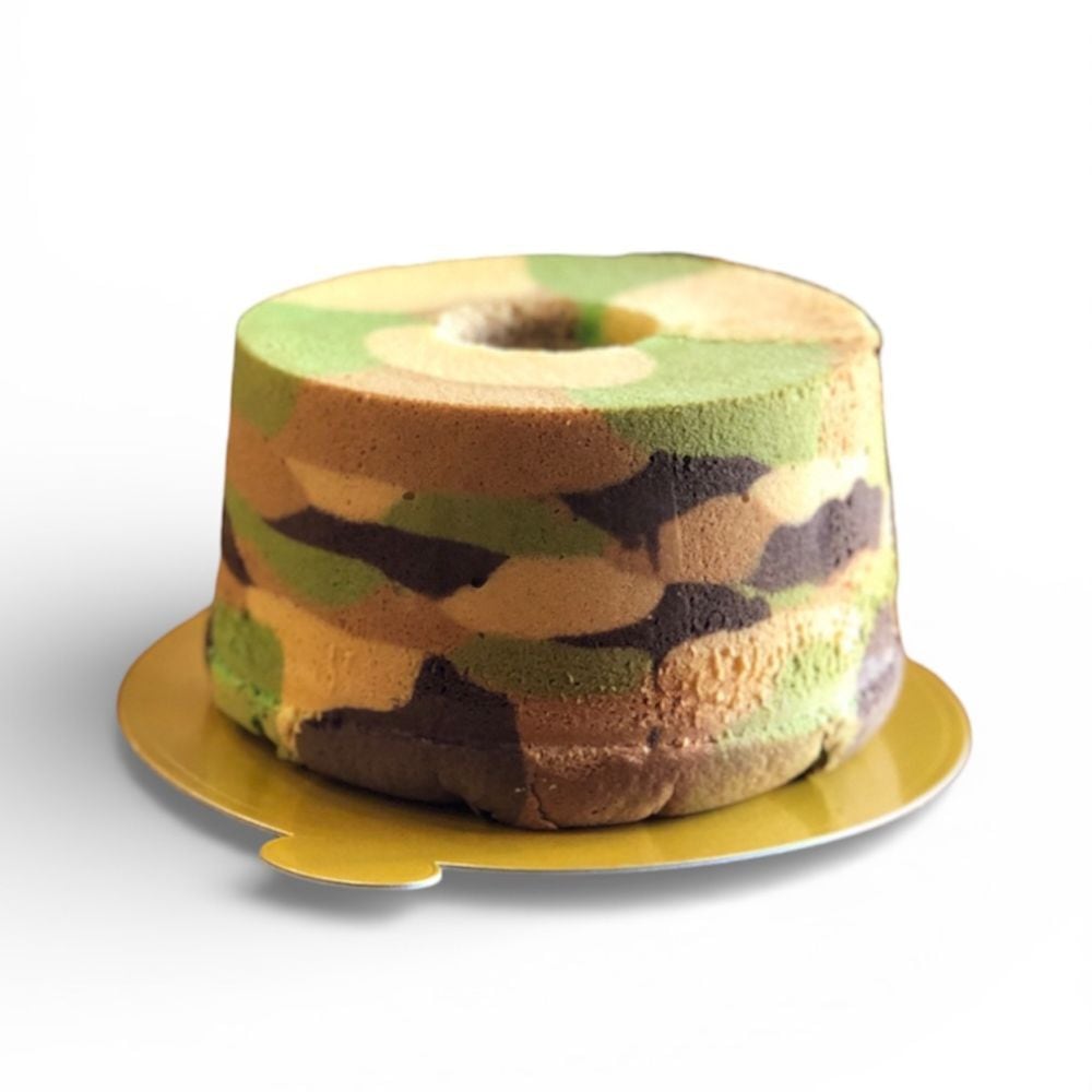 ふわもこのカモフラ柄のシフォンケーキです♪プレーン、ココア、ブラックココア、パンダンペーストの4種類の生地をカモフラ柄にデザインして焼き上げました!かわいい柄が差し入れなどにも大人気です!4種類の生地のマリアージュをお楽しみください★